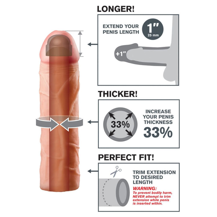 Add 1 inch to your length and become 33% thicker with this super stretchy, customizable extension. Just trim it at the base to make the perfect fit for you penis and allow your partner to enjoy deeper penetration.