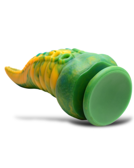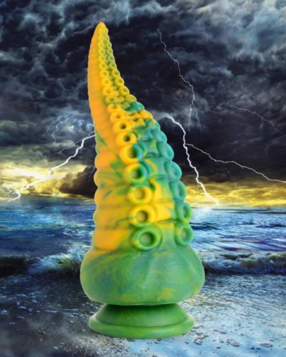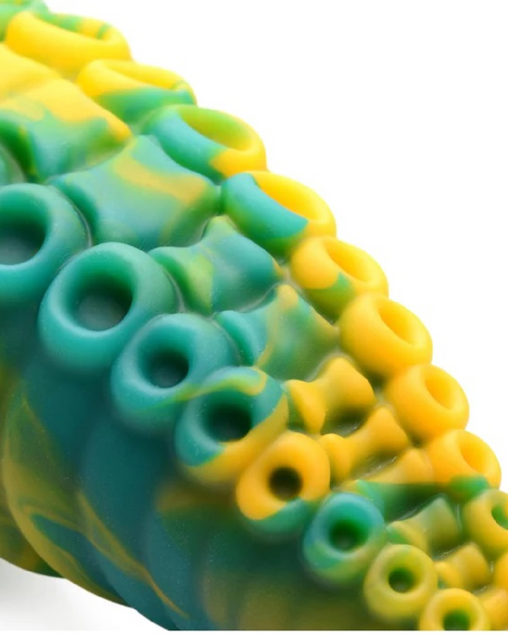 This Monster Octopus is coming for you from the depths of the sea and the darkness of your deviant mind! Let your fantasies run wild with tentacle sex role playing! This long, tapered dildo has a marble green, yellow and blue color that is unique to each dildo.